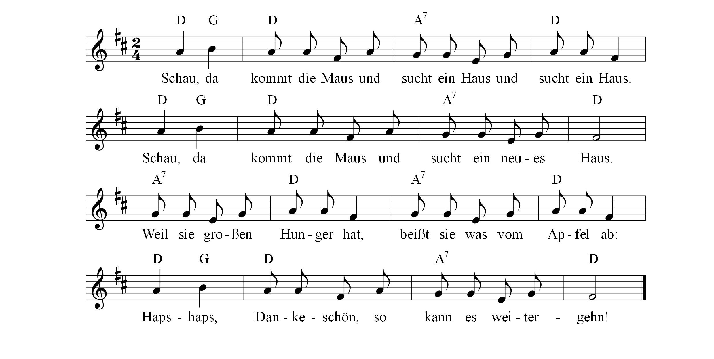 „Schau, da kommt die Maus / und sucht ein Haus / und sucht ein Haus / Schau, da kommt die Maus / und sucht ein neues Haus / Weil sie großen Hunger hat / beißt sie was vom Apfel ab / Haps-haps – Dankeschön / so kann es weitergehn!“