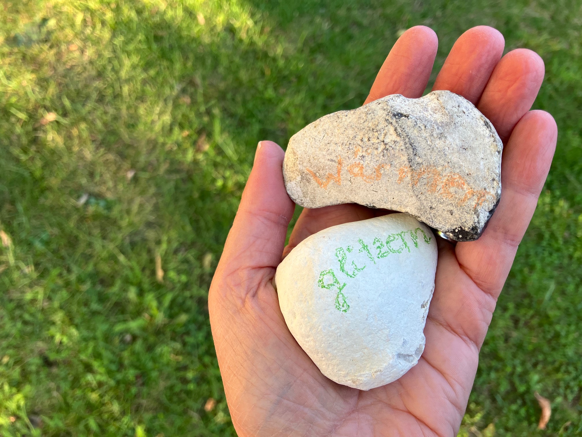 Erzählen, singen, klingen & entdecken – gerade zur hellen und warmen Jahreszeit lässt sich das Wechselspiel zwischen verschiedenen kreativen Ausdrucks- und Entwicklungsmöglichkeiten zu Kamishibai-Geschichten und anderen dialogischen Erzählformen besonders vielfältig und naturverbunden gestalten. In den Rucksack für Fortbildungen und Angebote dazu gehören für mich aktuell u.a. weiße Kieselsteine vom Ostseestrand, Buntstifte, Kalimba, Klangkugel, Kamishibai, Bücher,